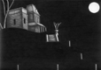 Woodfine explores imaginary worlds that border between the familiar and fantastical. There is a certain element of gothic darkness to her work. This is conjured up through the relationship between the precise and heavily drawn pencil process she employs combined with the subject matters depicted. Her drawing method employs a repetitive almost obsessive-compulsive process. All her work centres on drawing. They often take the form of three-dimensional constructions in cases and glass domes. They also exist as two-dimensional drawings sometimes encased in liquid filled domes. " Woodfine’s drawings, often contained within specifically constructed structures that act both as frames and as physical extensions of the drawing itself, operate as miniature worlds, self-contained systems through which a series of vignettes are staged for the viewer’s careful consideration" *1 Her subject is strongly influenced by half remembered memories from childhood. She employs a wide variety of visual imagery exploring themes surrounding darkness and magic. Scenes are always depicted at night time as if lit by moonlight. "Woodfine’s drawings delve into the dark side of our collective unconscious, exploring dreamlike imagery that is rooted in childhood yet easily causes tremor among adults" *2 *1 text by Peter Suchin |