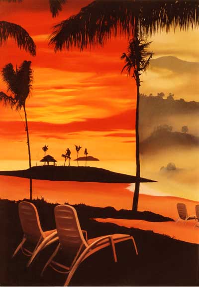 Zaleski 2001 (detail) oil on canvas 108 x 136 cm 17 November to 16 December 2001In a new series of paintings Katie Deith investigates the visual language of seduction and escapism. Romantic visions are juxtaposed like fragments of memory reflecting our nave aspirations to escape to idyllic places. The initial familiarity of the stereotypical landscapes, recalling images found in the media and holiday brochures, is displaced by disorientation not dissimilar to that of a dream: the compositions are broken, the colours accentuated, the reality shifted. Katie Deith finished her BA at the Slade in 2000. Recent exhibitions include : 2001 - Bittersweet, Danielle Arnaud; Atelier Something, Dalston, London. 1999 William Coldstream Painting Exhibition, Slade Gallery, University of London. 1998 Hong Kong, City of Life, Albermarle Gallery; J. Walter Thompson, Berkeley Square, London.
