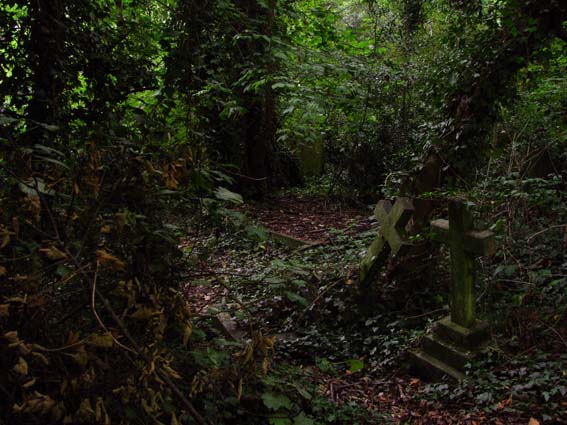 As part of an exploration of London’s burial grounds & cemeteries the artist has produced a series of photographs taken within a Victorian graveyard. Due to the changing social attitudes and economics towards death, this resting place has been left to the ravages of nature and time. The rampant dense green woodland contrasts sharply with the broken remains of gravestones and memorials to deceased loved ones, now lost in the wilderness. The majority of the final resting places have been lost to nature but some paths have been maintained and are clearly visible leading the way through darkened mass of contorted brambles, ivy and roots; sometimes they lead nowhere but occasionally they lead to tended graves, little islands among their long forgotten neighbours.