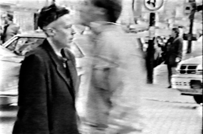 Mr B is the romantic male alter-ego of Cathy Sisler. Through dress and gesture she recreates herself on the streets of the city. Archetypal movement and poses reveal the transparency of identity formed through visual reference. The romantic music urges the viewer to narrativise the scenes, highlighting the manipulative process of the medium.